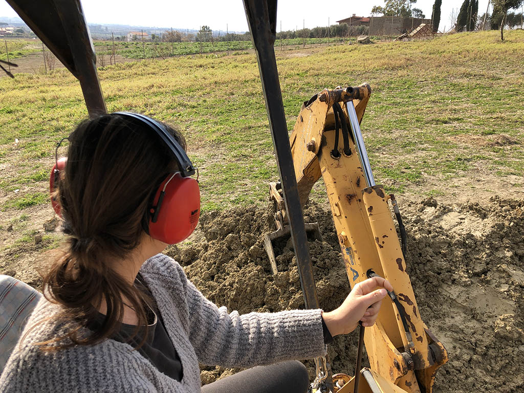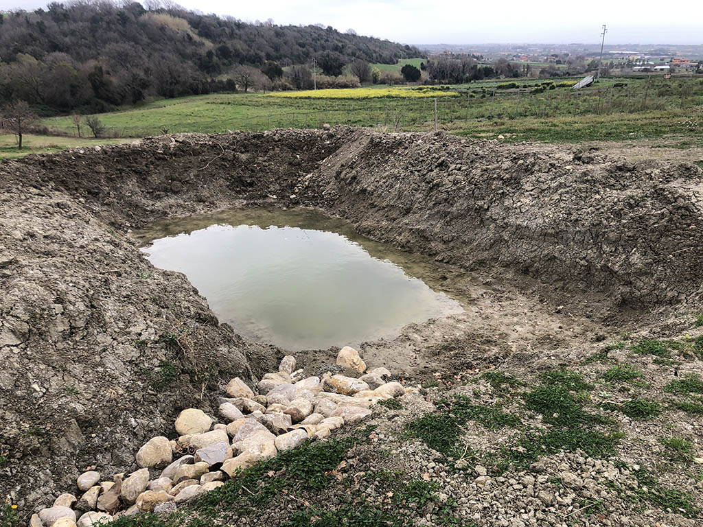 Scavo e posizionamento di un bacino di raccolta, con canali di immissione e di uscita.
